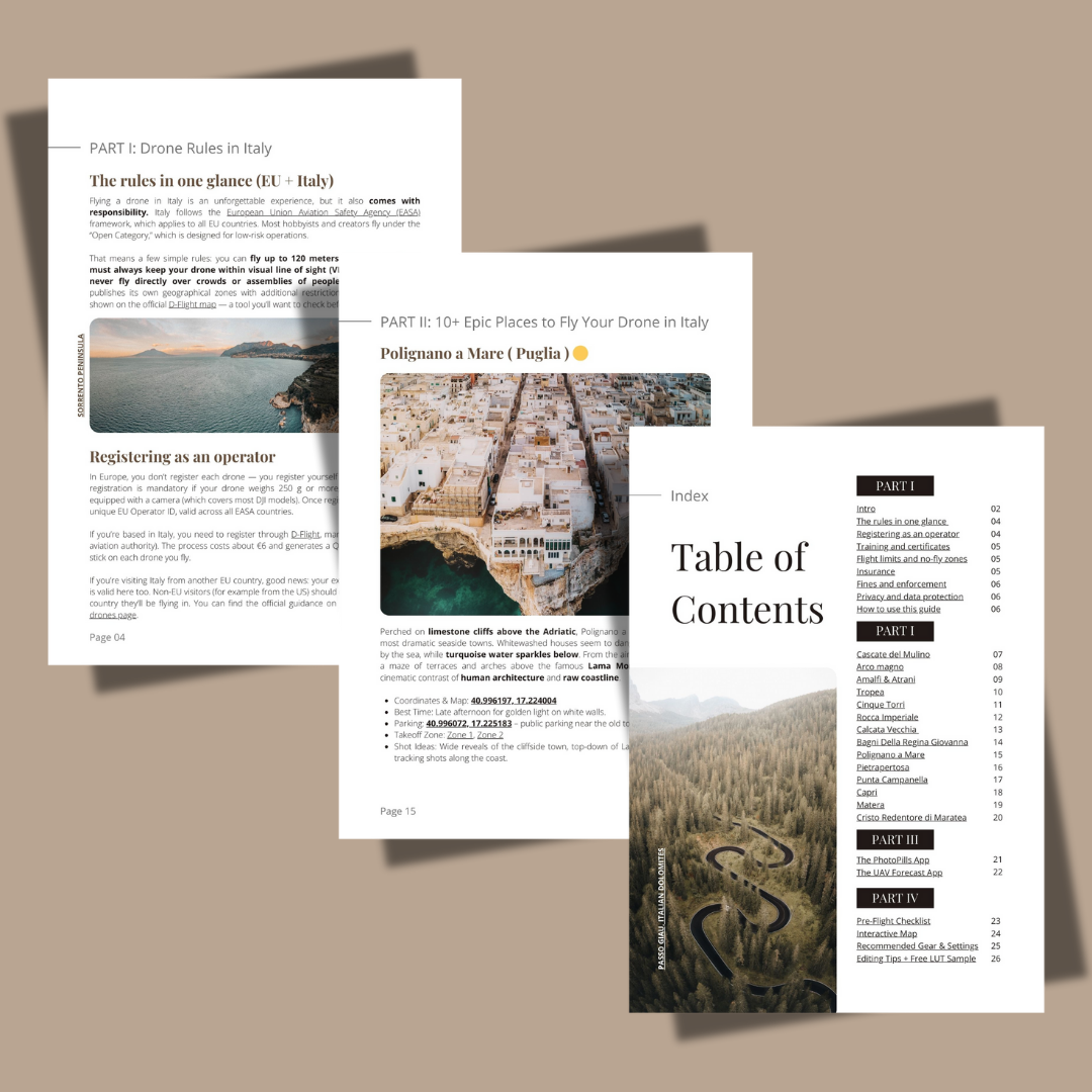 That’s why I created this premium drone guide: a complete toolkit designed for creators who want to capture Italy from above with confidence.
